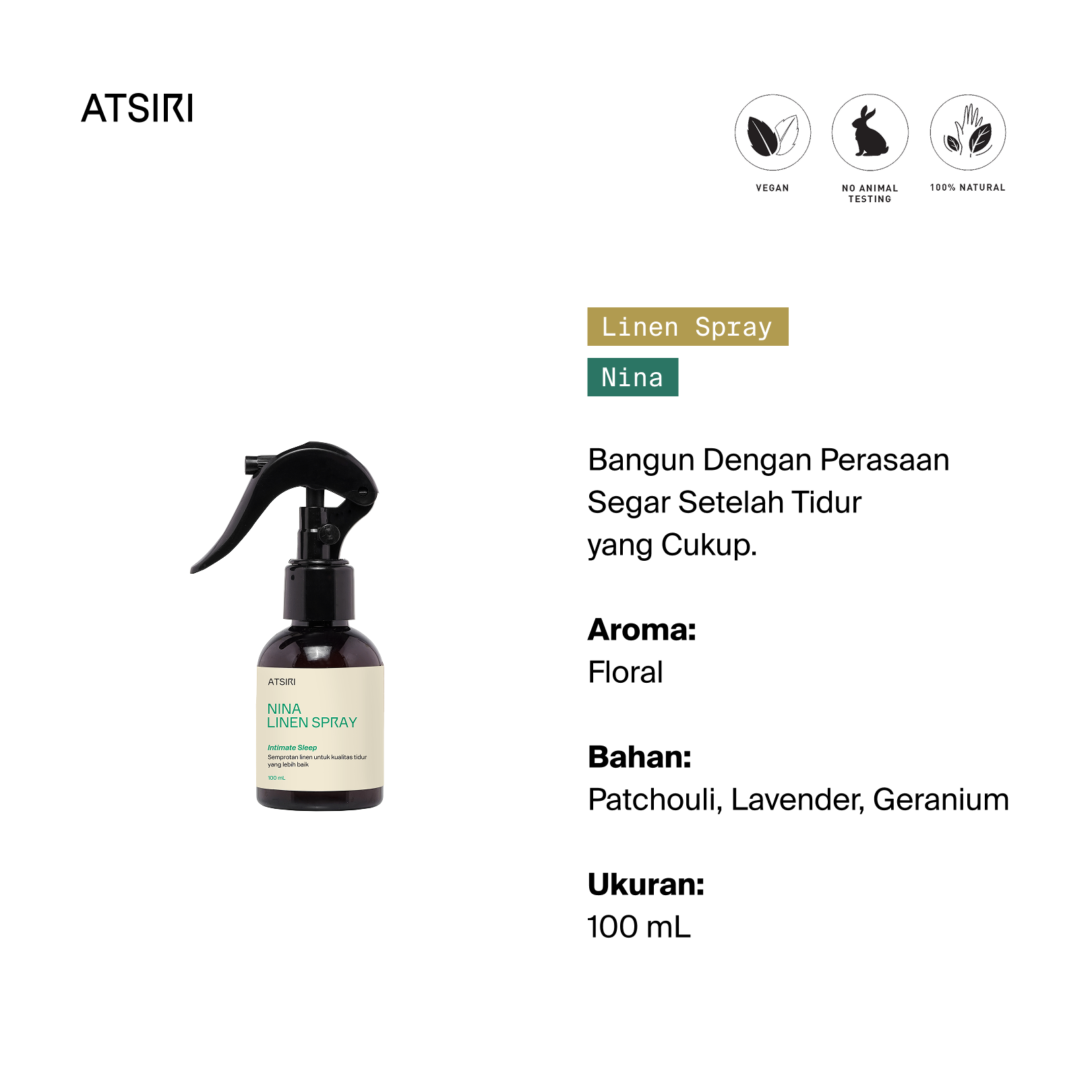 Ciptakan suasana positif dan bersemangat dengan Nina Linen Spray. Minyak atsiri lavender, geranium, dan patchouli membantu meningkatkan mood dan kualitas tidur, cocok untuk kamar tidur dan ruang tamu.