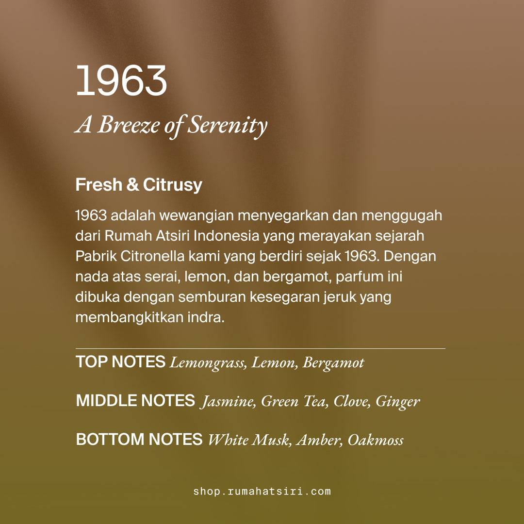 Aroma serai yang menyegarkan membangkitkan kenangan akan Pabrik Citronella di Plumbon, yang menjadi cikal bakal Rumah Atsiri. Kini, esensi 1963 hadir dalam botol, merangkum aroma serai dan lemon yang segar di penghujung hari. | In honor of its noble heritage, Rumah Atsiri encapsulates the refreshing blend of lemongrass and lemon into a bottle. It represents Indonesia's dreams in 1963: to become the best producer of essential oils in the world.
