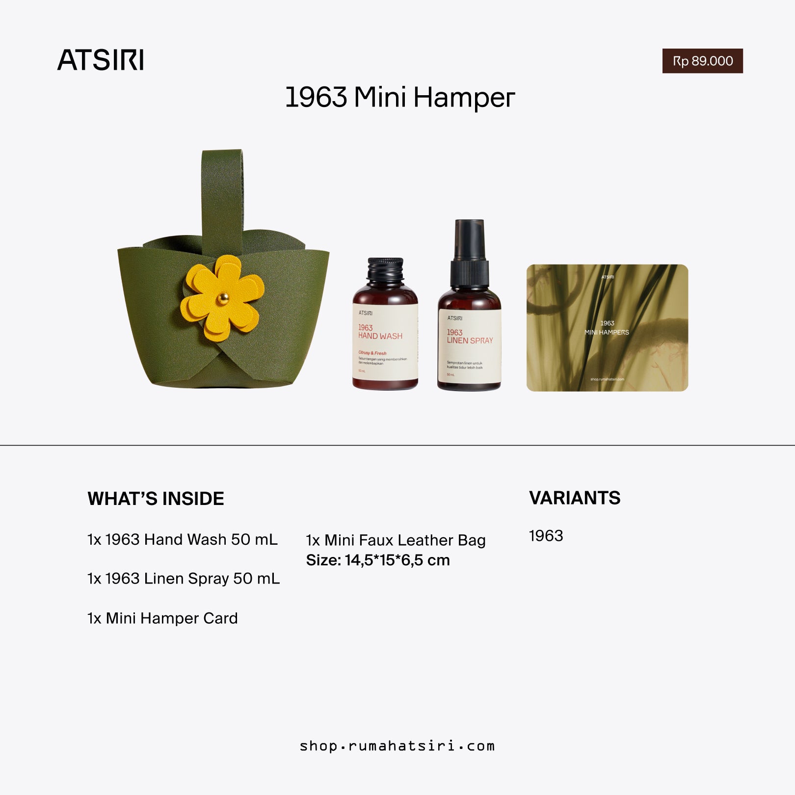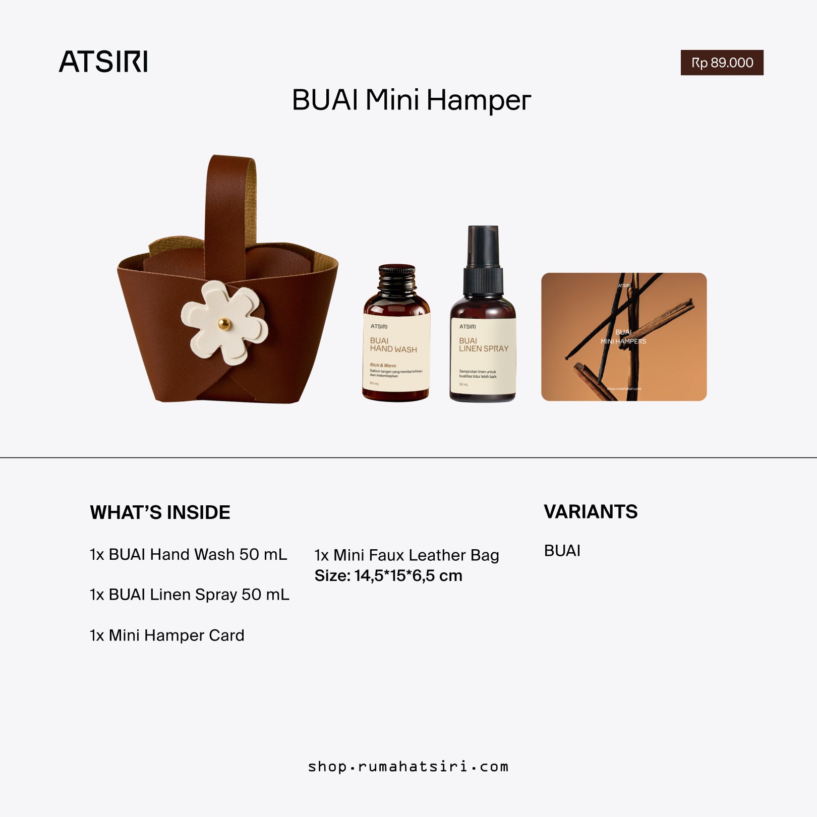 Experience our all-time favorite scent, 1963, RAYU, BUAI, in the form of mini products. This cute gift includes a 50 ml hand wash and a 50 ml linen spray inside a reusable faux leather bag.