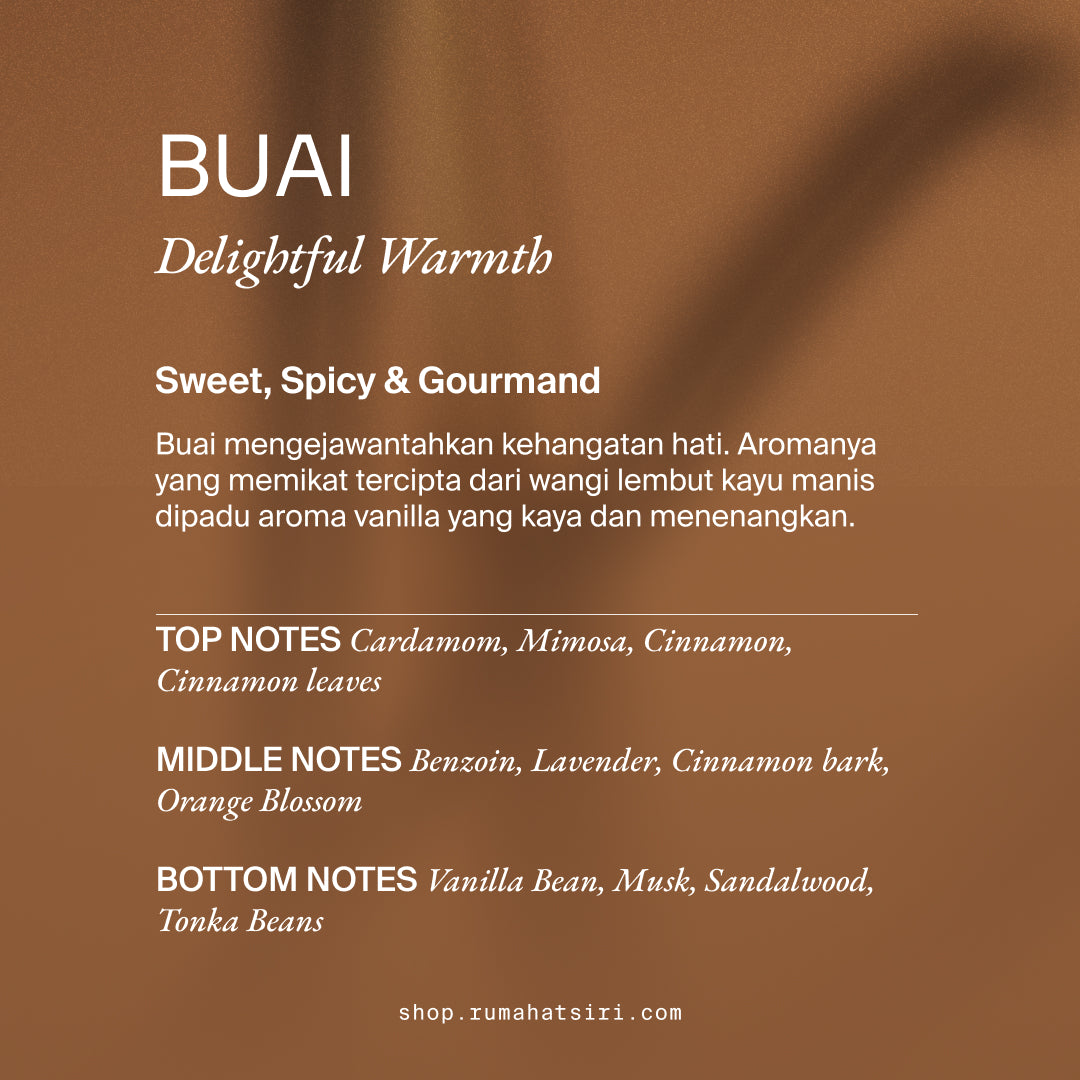 Buai mengejawantahkan kehangatan hati. Aromanya yang memikat tercipta dari wangi lembut kayu manis dipadu aroma vanilla yang kaya dan menenangkan. | Buai captures an inner sense of warmth. The alluring scent is created from the subtle woody tone of cinnamon in collaboration with a rich, comforting scent of vanilla.