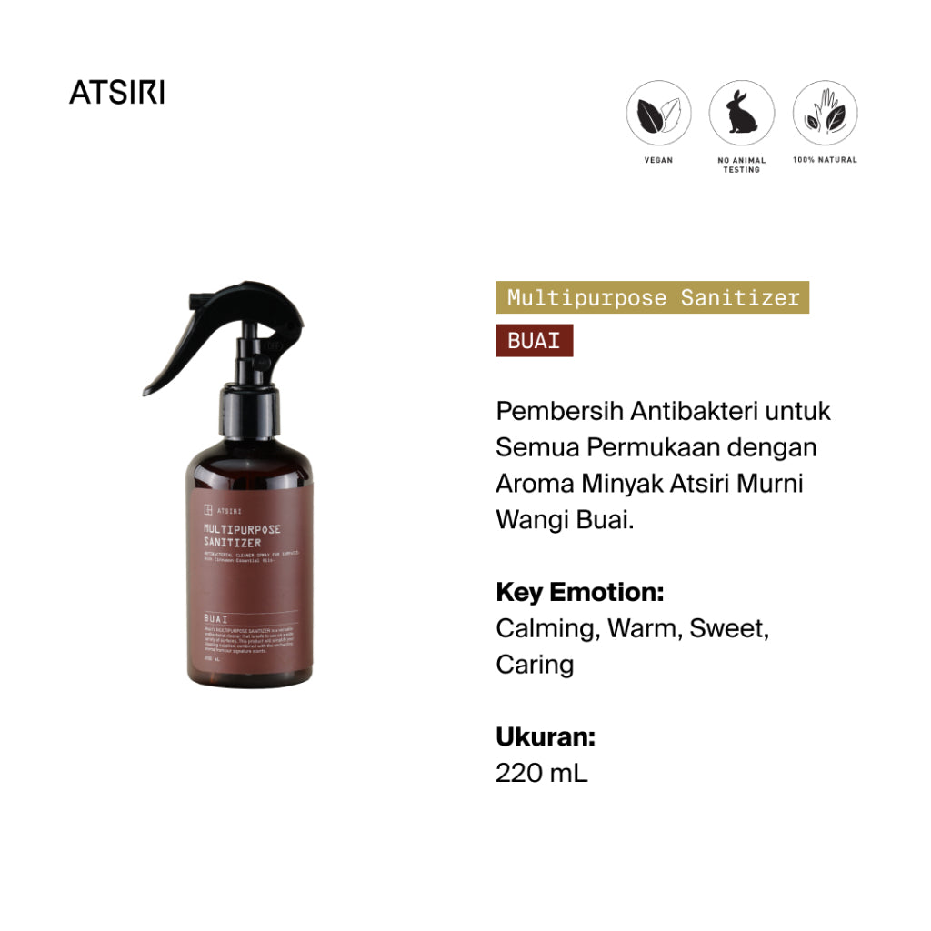 Bersihkan dan lindungi permukaan benda dari kuman dan bakteri dengan Buai Multipurpose Cleaner Spray. Diperkaya dengan minyak atsiri Cinamon dan Vanilla, Multipurpose Cleaner Spray ini memberikan perlindungan ekstra dan aroma yang menyegarkan.